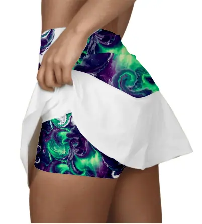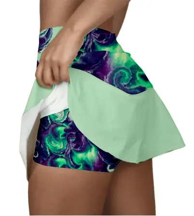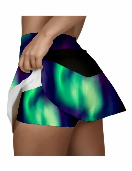 La falda de talle bajo de esta colección está inspirada en los cielos del norte y en la belleza hipnótica de la aurora boreal. Su estampado artístico fusiona delicados tonos verdes y púrpuras que evocan luz, movimiento y un aire de fantasía contemporánea.